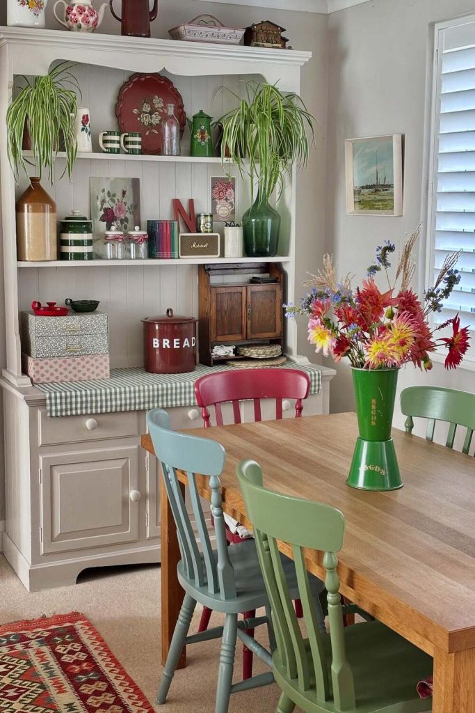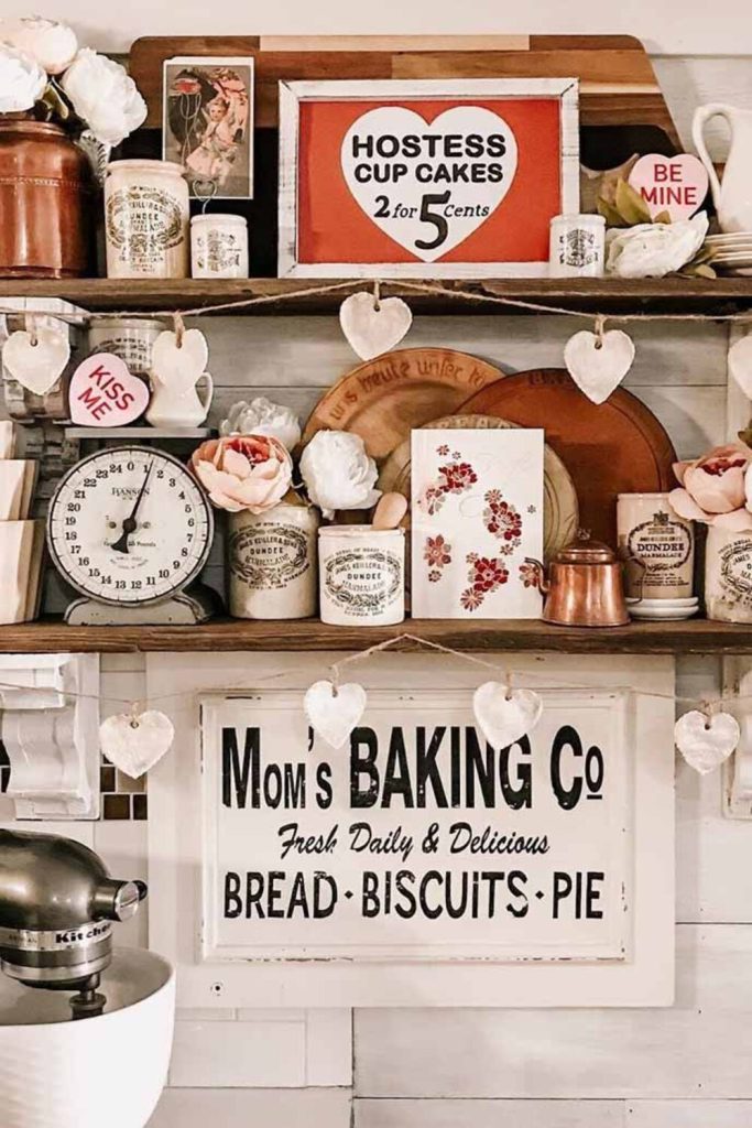 Red enamel pots, vintage Pyrex in pink, and a honeycomb heart garland strung across open shelves — this kitchen corner is pure retro joy. The little “XOXO” sign on the chalkboard and scattered conversation hearts make it feel like Valentine’s Day breakfast is always ready.