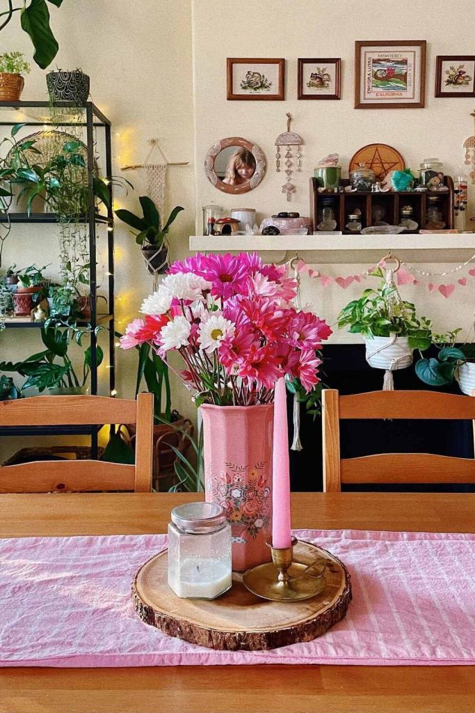 This little spot is my dream corner! An old writing machine holds a love note. Shiny glass cups hold many tiny roses. A string of paper hearts dances above old tea cups. The mix of dark silver and soft pinks feels very lived-in. It looks very romantic. I would drink coffee here every day in February if I could.