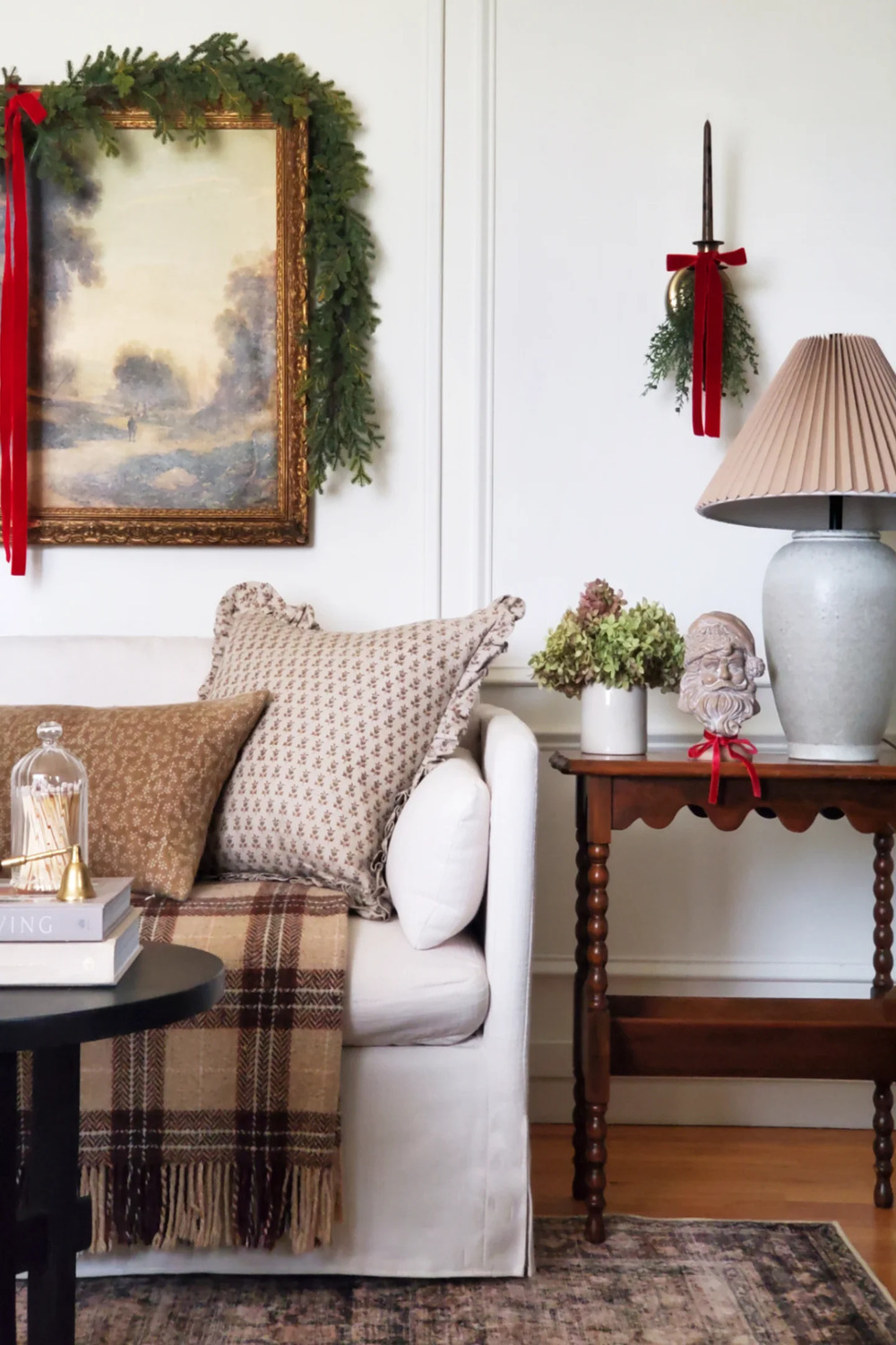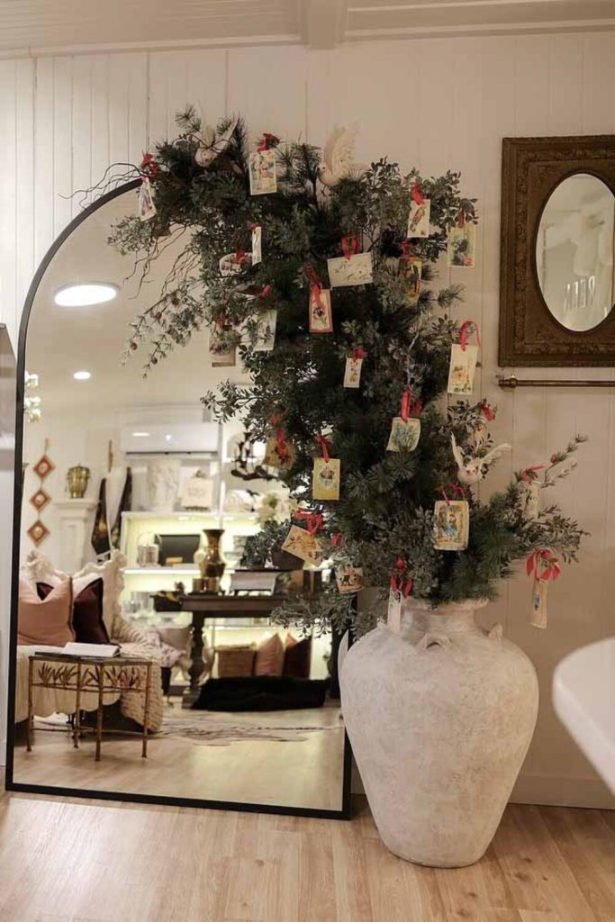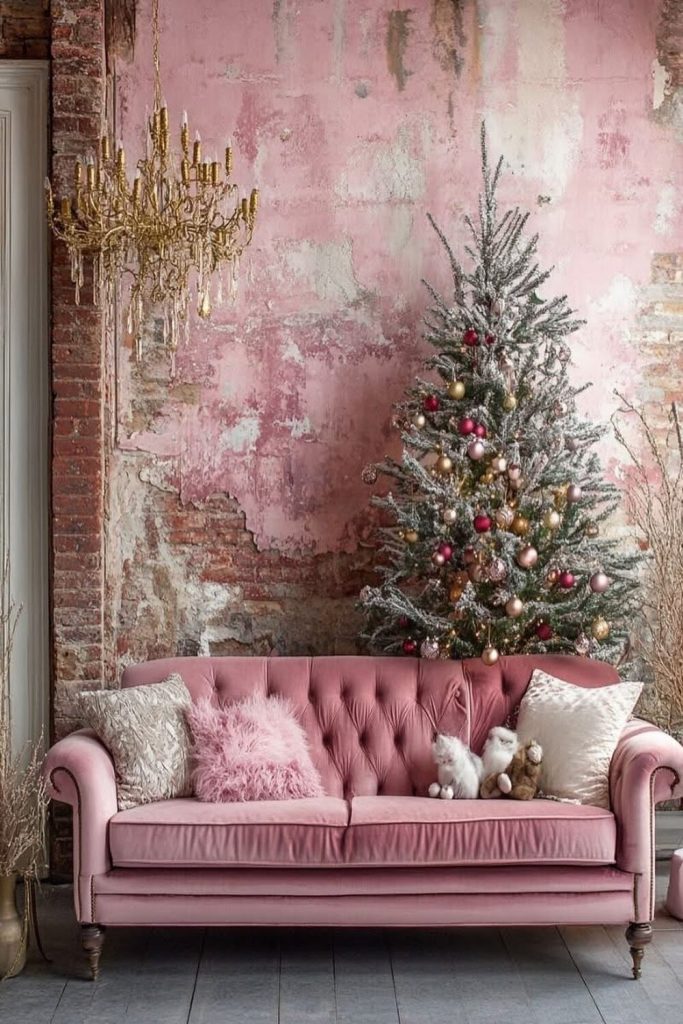 The softest blush pink and cream dream — bottle brush trees dyed rose, vintage valentines propped everywhere, and the gentlest fairy lights. It’s cozy minimalism meets old-world romance, and I can’t stop staring.