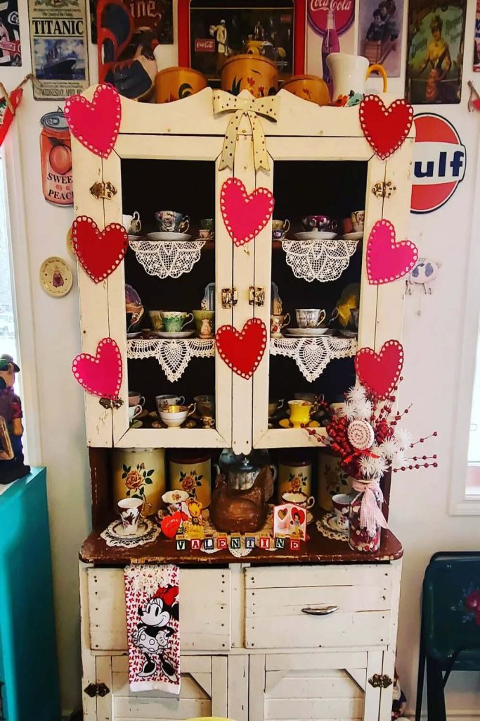 China hutch doors flung open to reveal pink transferware, heart-shaped doilies, and the sweetest collection of cherub figurines. It’s like your cool aunt who collects Valentine ephemera invited you over for tea.