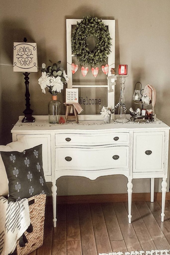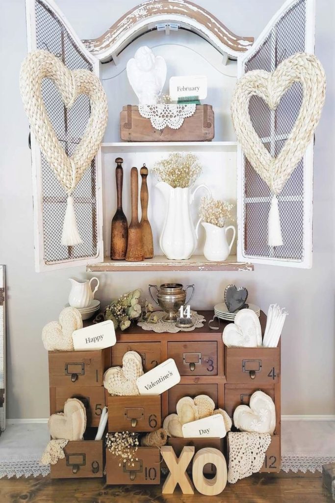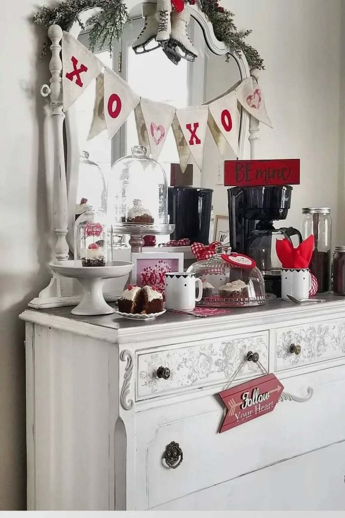 A white dresser has a few chips. It holds the prettiest old valentines. Add dried white flowers and one red candle. It is simple but feels very private. A lace cloth sits on top. Small cupid dolls look loved for many years. This spot shows you do not need much. Use a few treasured old items. Add soft light. This makes your room feel like a love poem.