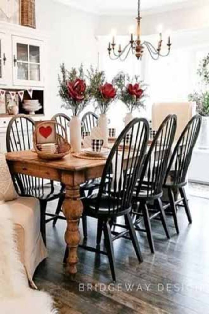 Red plastic chairs look cool. Add a cherry-red old radio. Hang a wavy heart garland. This small eating area is like a 1950s movie scene! Candy hearts spill from an old white glass bowl. Paper lace doilies peek out near every plate. A bright blue blender keeps it fresh. It is not too sweet. I love that they used normal kitchen items. This made that old soda-shop date feel right at home.