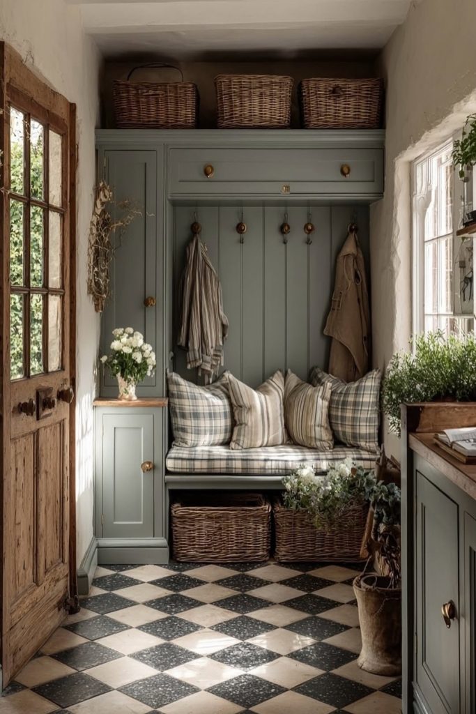 Hooks, baskets, and a sturdy rug. This mudroom handles the “garden” part of “farmhouse” life beautifully, keeping the dirt out and the style in.