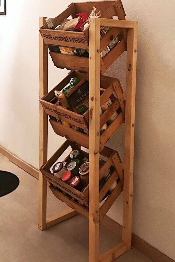 This box pantry makes me so glad. We used old soda crates. They became pull-out trays inside a plain shelf. Now, all items look neat. Pasta and spice pots all look cool. The red print on the wood is fun. I will use this for my own kitchen next month.