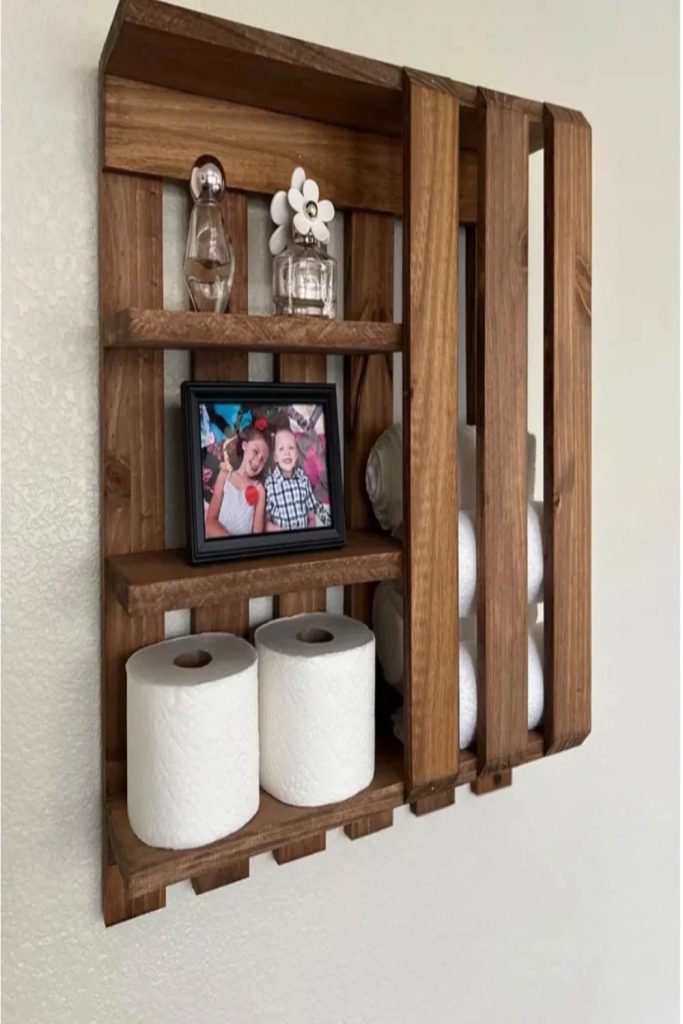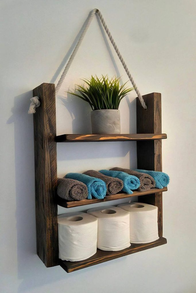 Open crates in the bath for towels is my new best idea. Roll your soft towels well. Add small trays of bath fizz. Hang flowers from the side. You get a quick spa feel. The raw wood with white tiles looks clean yet warm.