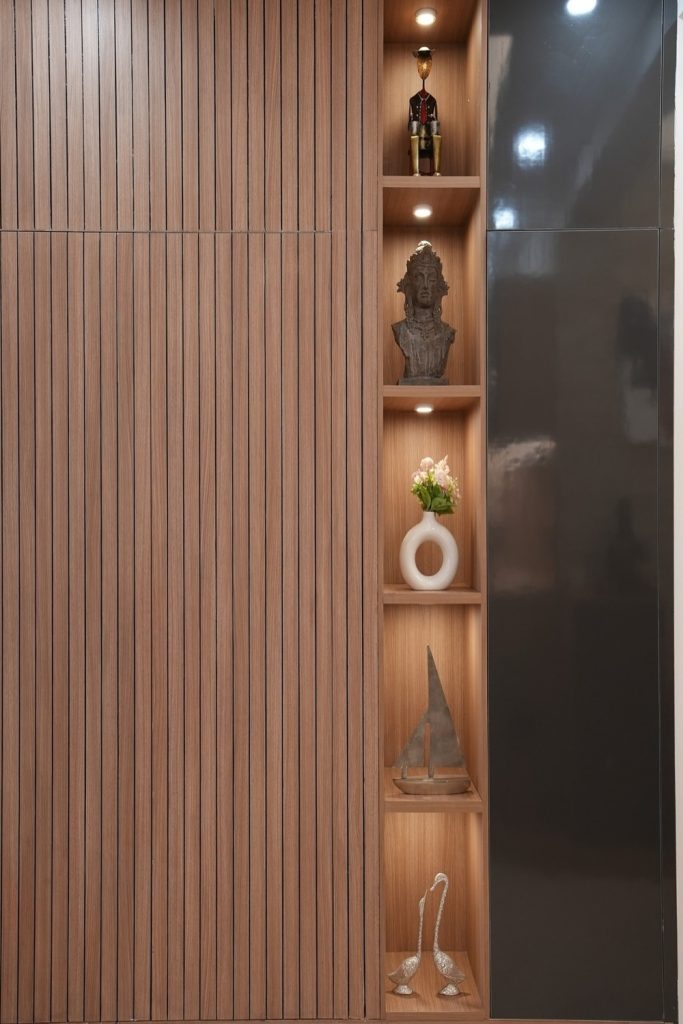 This is a masterclass in “Japandi” style—the intersection of Japanese functionality and Scandinavian comfort. The use of vertical wood slats is a huge trend for 2026, and for good reason! It adds incredible visual depth without cluttering the room. From my experience, adding a slatted feature wall or room divider is the ultimate wooden house decor refresh. It filters light in such a poetic way. If you’re looking to add a bit of “soul” to a new build, this is exactly how you do it. It feels curated, expert, and deeply calming.